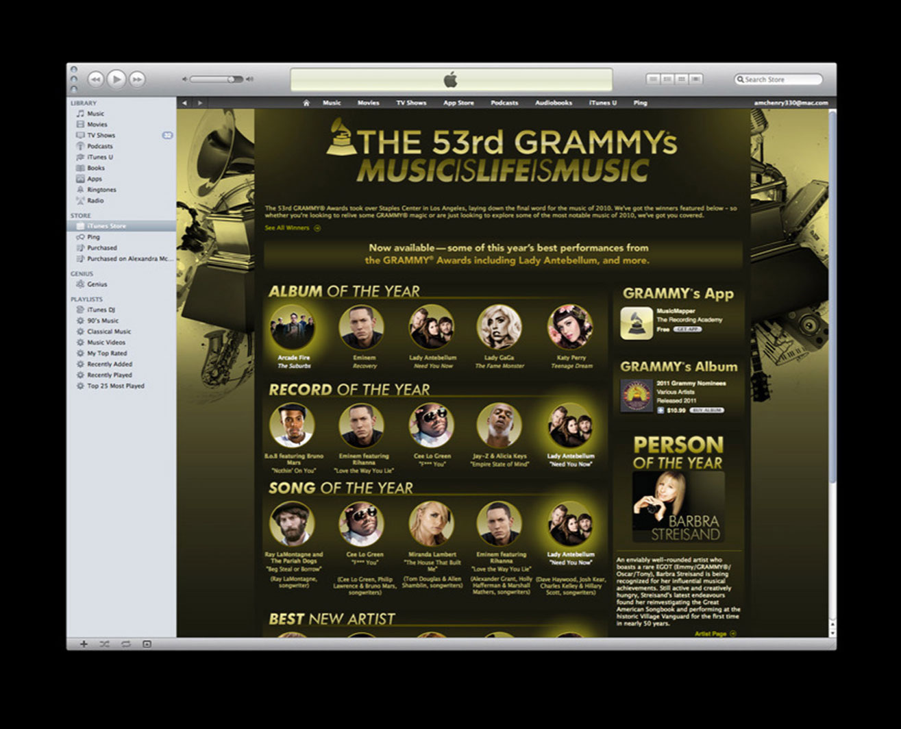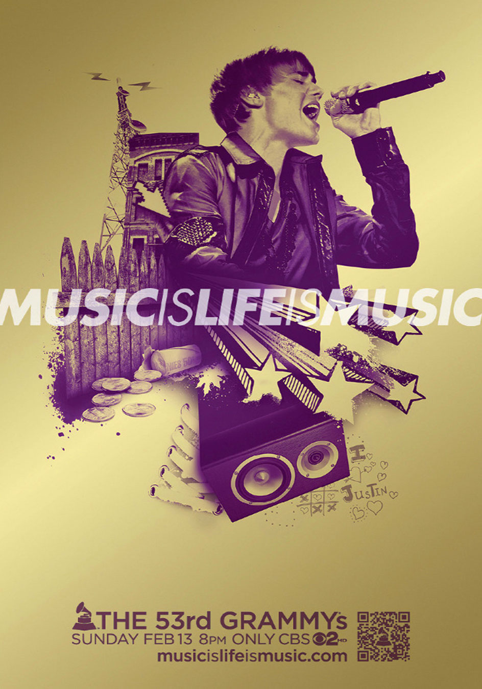 While Design Director at Chiat/Day we created the 53rd Grammy's campaign. Everyone has a musical journey. The campaign—which includes print, outdoor, digital, TV, a microsite, and the MusicMapper app, celebrates the songs and artists that made an impact during the past year and the places to which they're connected. The print and out-of-home visually depict the journey of select GRAMMY nominated artists. In addition, an accompanying microsite was created; MusicIsLifeIsMusic.com. There, you can tag any location in the world and view, on a map, all tags to-date.